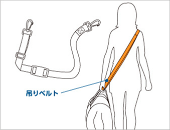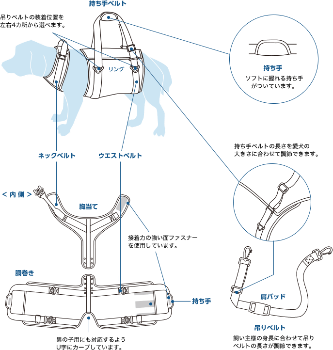 付属の吊りベルトには肩への負担を軽減できるよう肩パッドがついています。吊りベルトの長さは愛犬の大きさや飼い主様の身長に合わせて調整することができます。