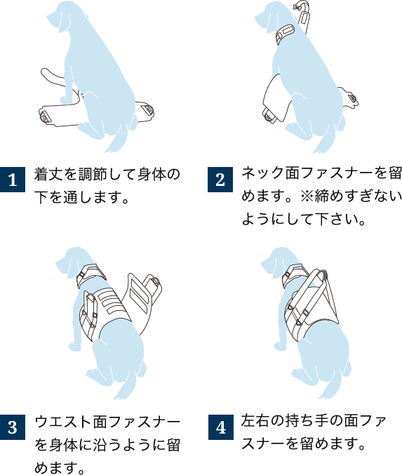 愛犬のサイズや毛の量に応じてボタンの位置を3段階に変えて、着丈の調節ができるようになりました。(スナップ間4cm)