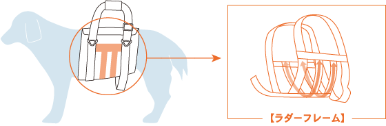 はしご状のフレームが愛犬の体重を分散して、歩行補助の際のテープの食い込みを防ぎます。