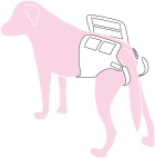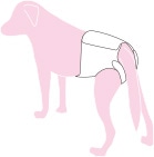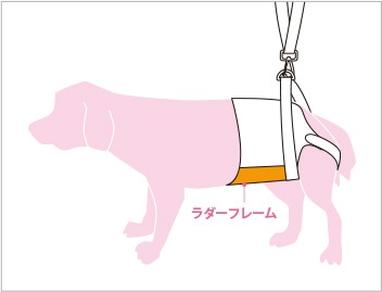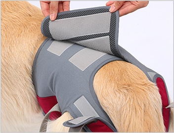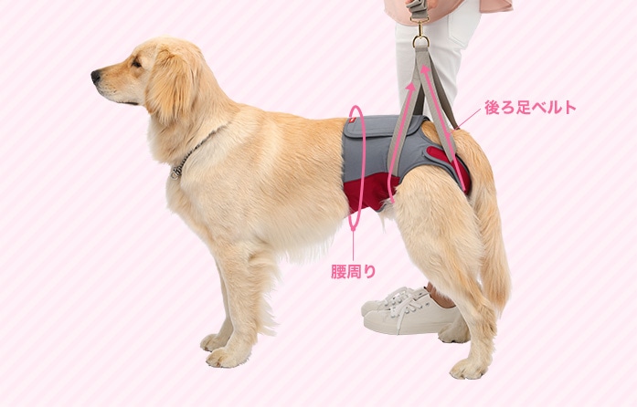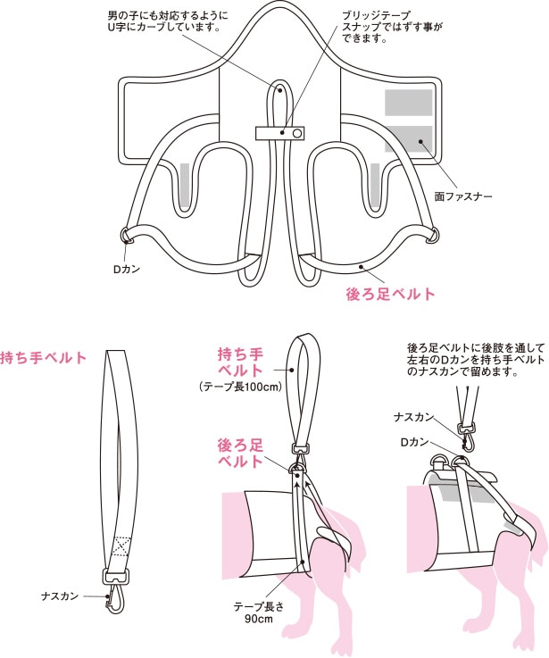 • 身体に沿うように胴巻きを面ファスナーで留めます。後ろ足ベルトを足の下からくぐらせます。