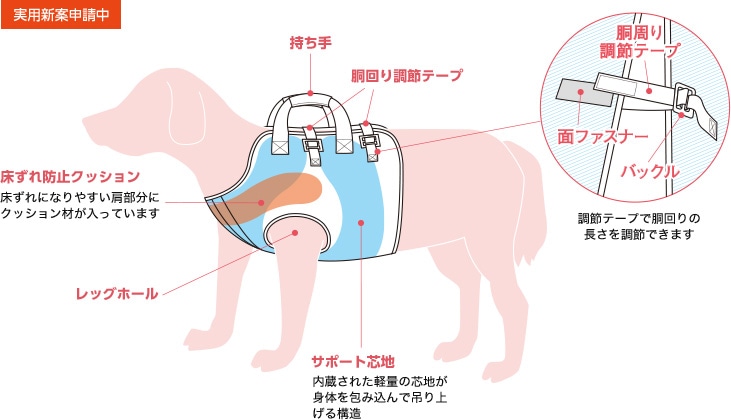 寝たきりのコは、寝返りをさせないと床ずれができてしまいます。「介助ベスト」と「介助パンツ」なら、大型犬の体位変換も楽にできます。