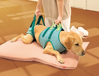 飼い主さんが「介助ベスト」や「介助パンツ」で補助して、リハビリ&トレーニングをしましょう。