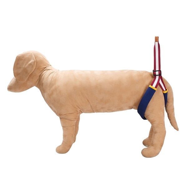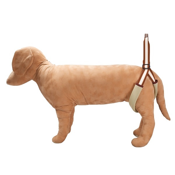 身体に沿うように胴巻きを面ファスナーで留めます。後ろ足ベルトを足の下からくぐらせます。