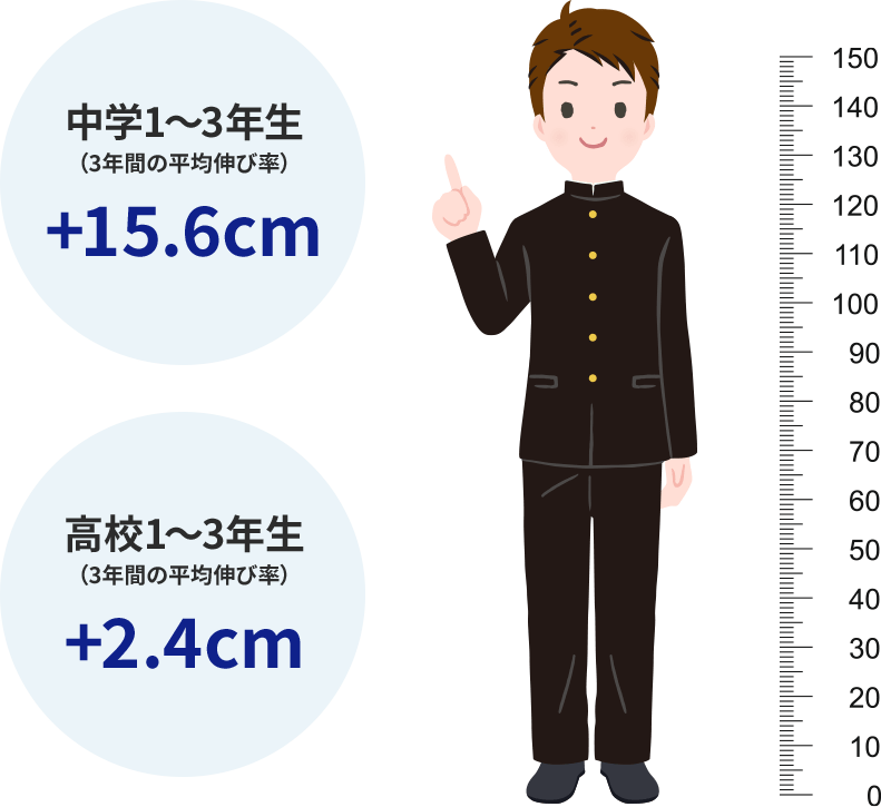 男子 平均身長 平均体重 12才 153.6cm 45.2kg 13才 160.6cm 50.0kg 14才 165.7cm 54.7kg 15才 168.6cm 59.0kg 16才 169.8cm 60.5kg 17才 170.8cm 62.4kg ※令和3年度 文部科学省「保健統計調査」より抜粋