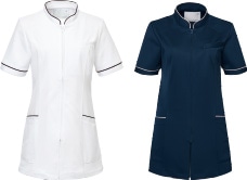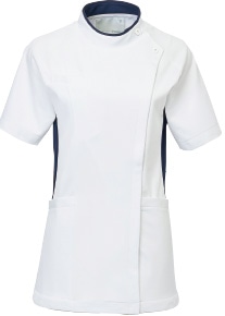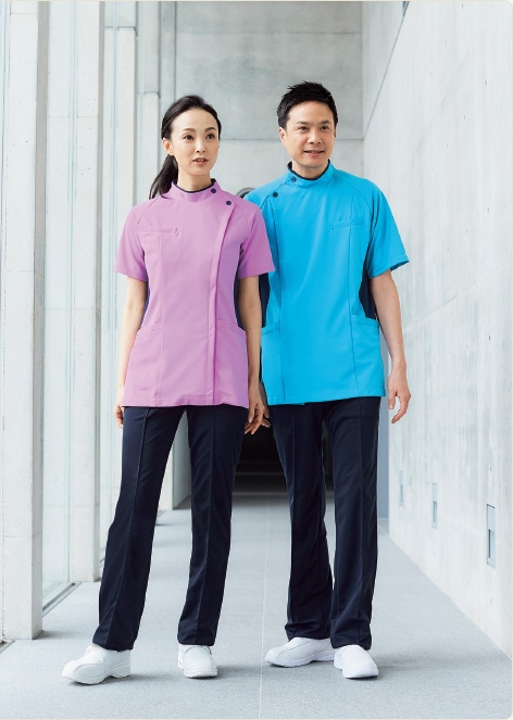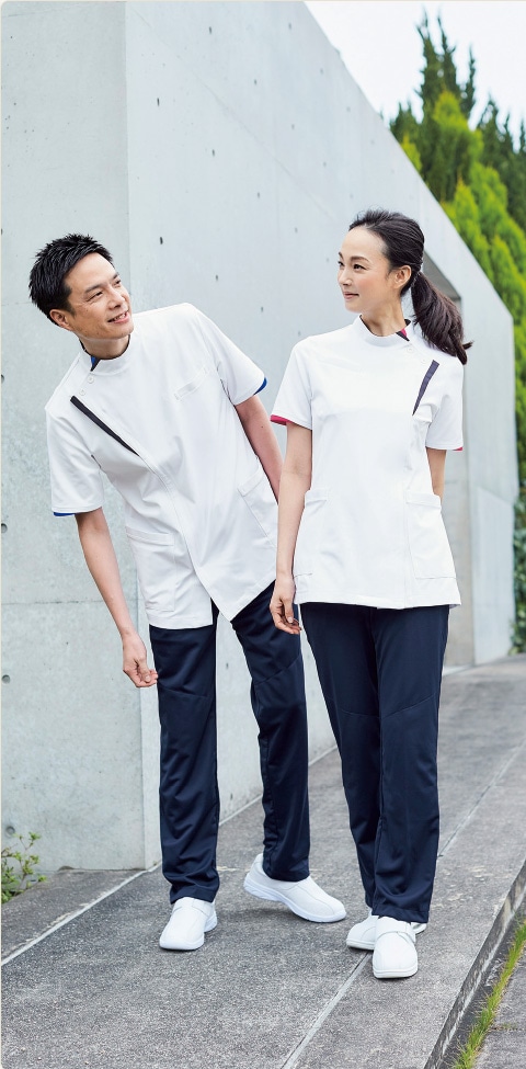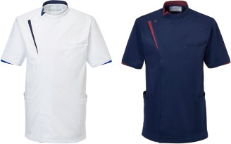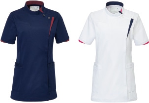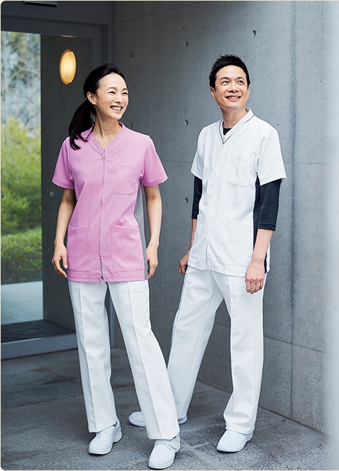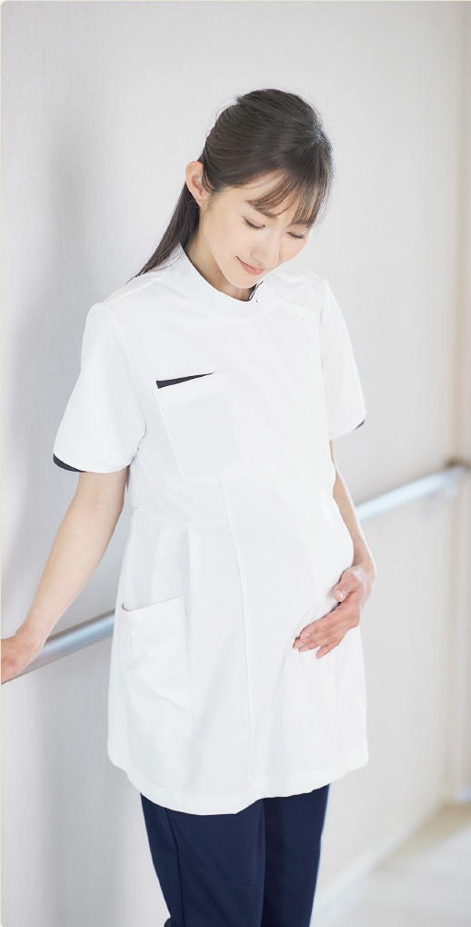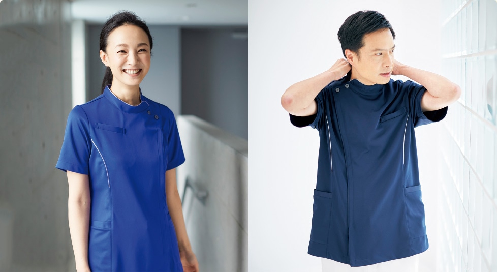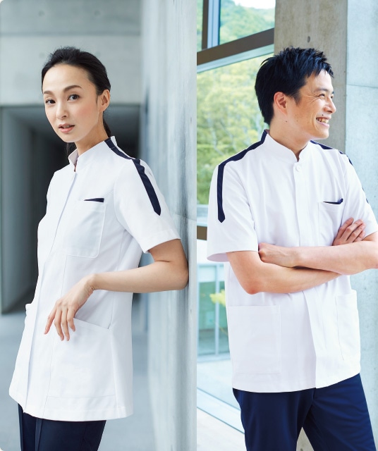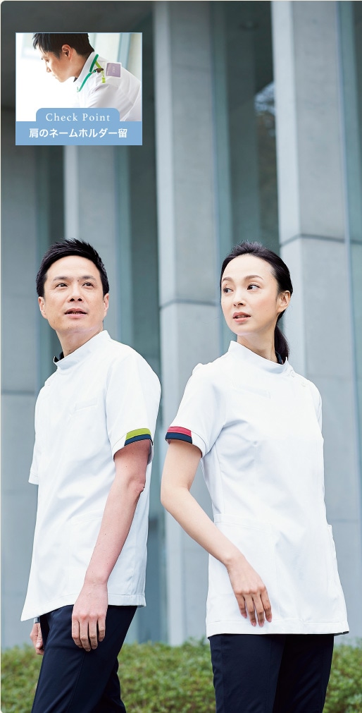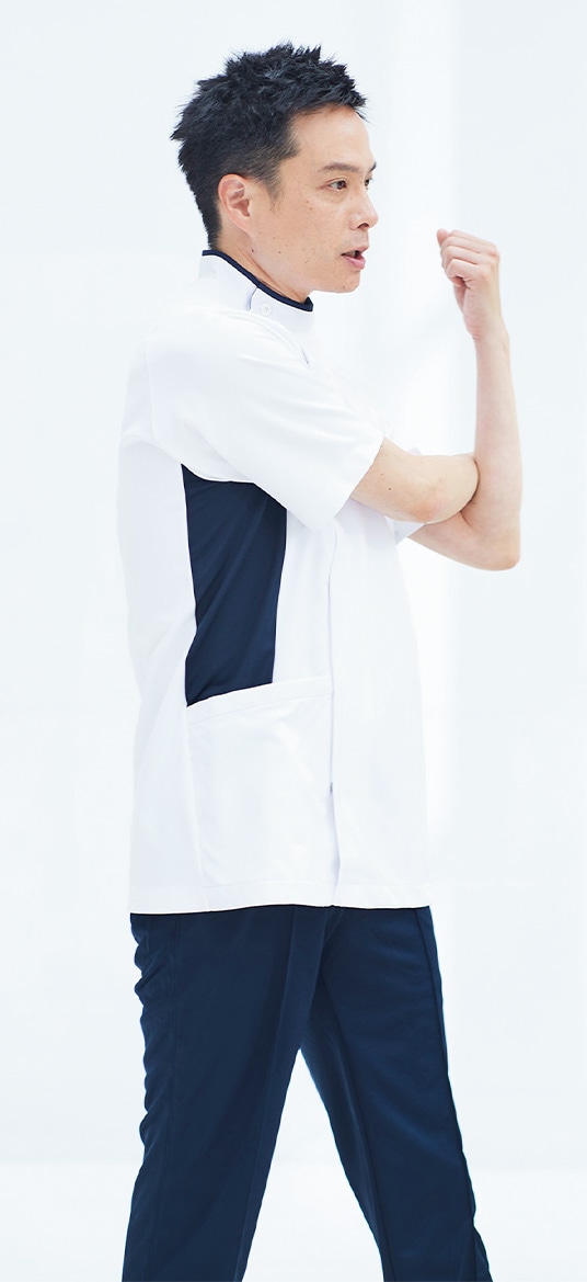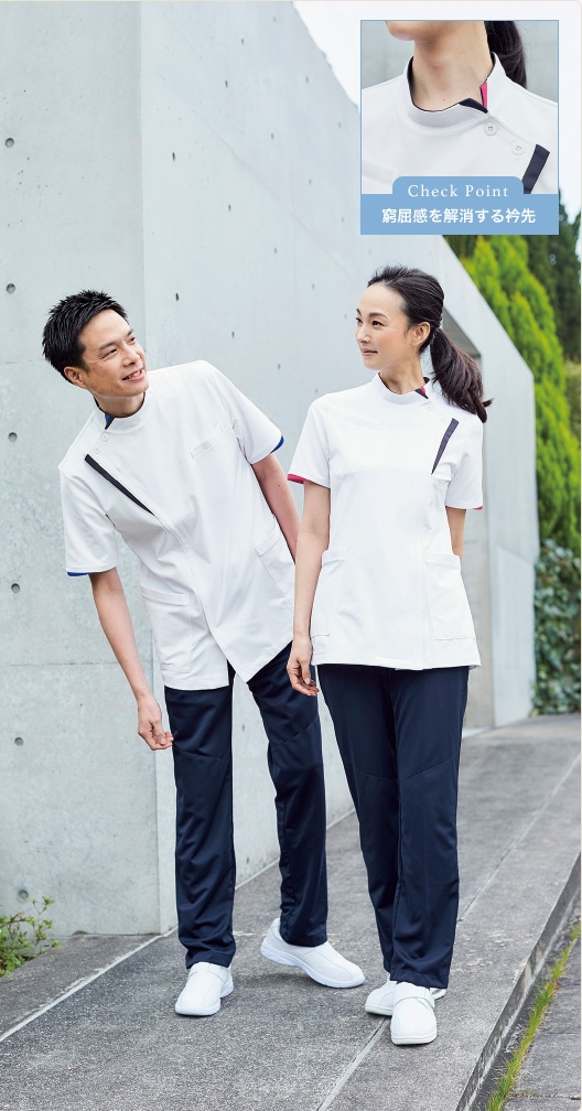 窮屈感を解消する衿先のカッティングや血圧計が入る大きめのポケットがポイントです。
