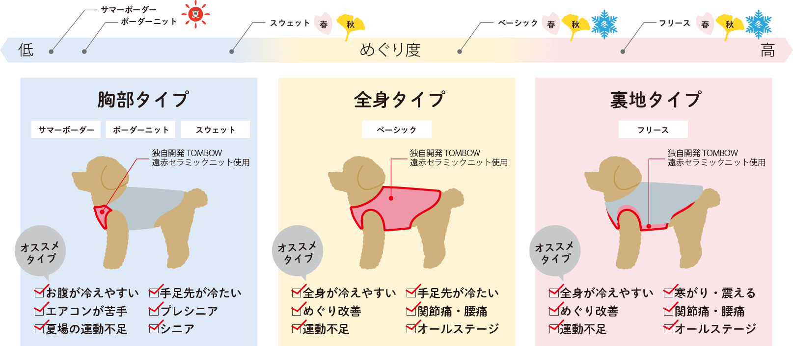 LaLaRelaxは独自開発の「TOMBOW 遠赤セラミックニット」を生地に採用し、愛犬のめぐりをサポートします。