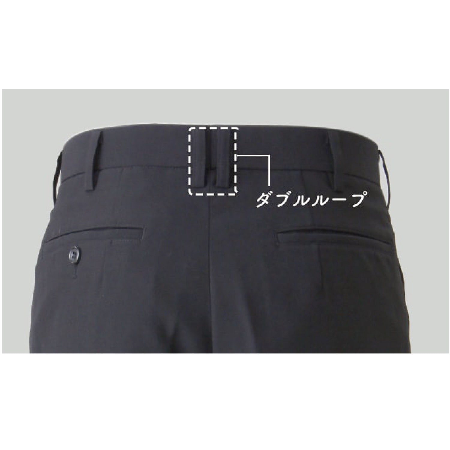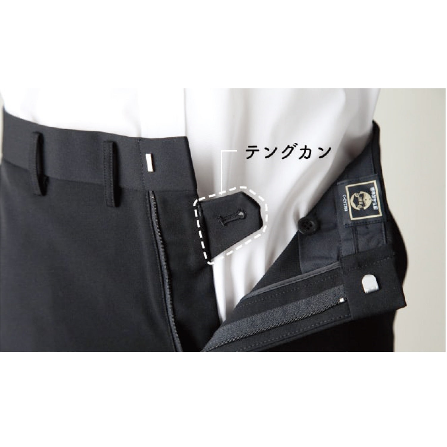 天狗の鼻のような形から「テングカン」と呼びます。テングカンがあることによって、スラックス着用時に、生地がよヨレずにお腹を固定させることが出来ます。また、固定されることによって、着用時の安定感がアップします。