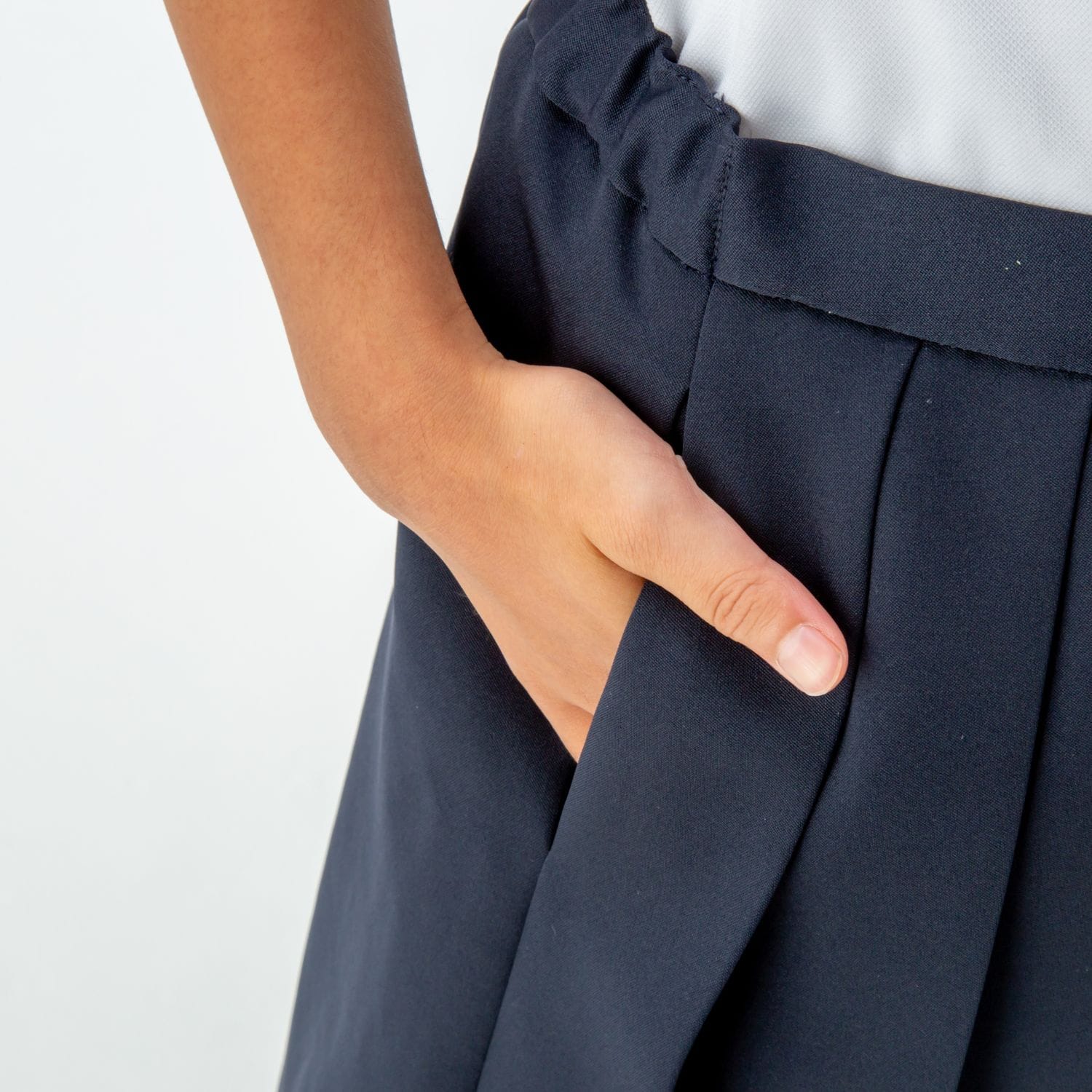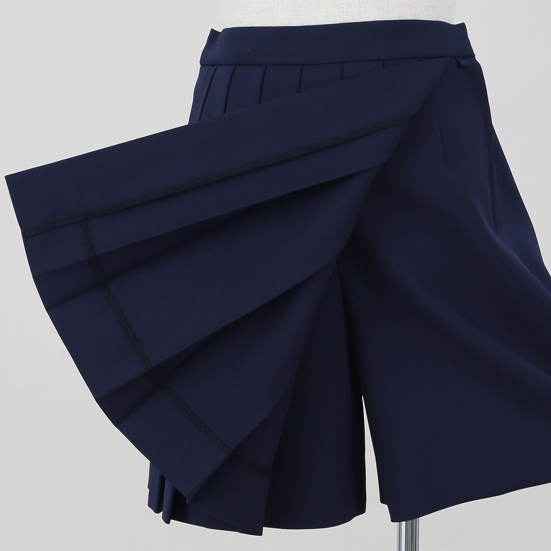 前側のみにプリーツがあり、その下は半ズボンの仕様になっています。そのため椅子に座るときなどにはプリーツのヒダが崩れる心配もありません。