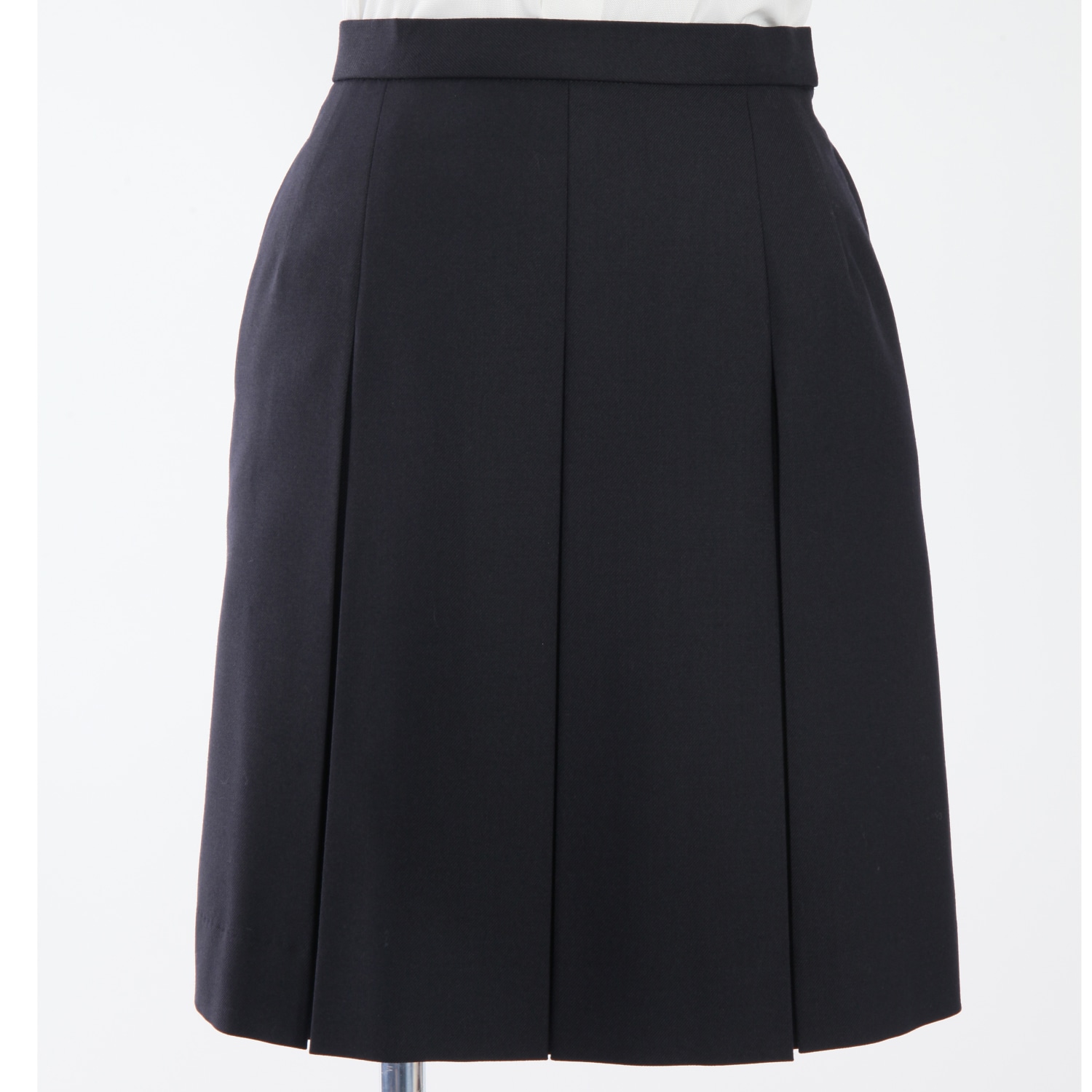 定番にもおしゃれにも着こなせる、6本ボックスひだのデザインスカート。いつもの車ひだスカートとはちょっと違 う、無地のデザイン紺スカートで周りと差をつけよう! 1年中使える素材です。素材:綾織 混率:ポリエステル 60%  毛 40%