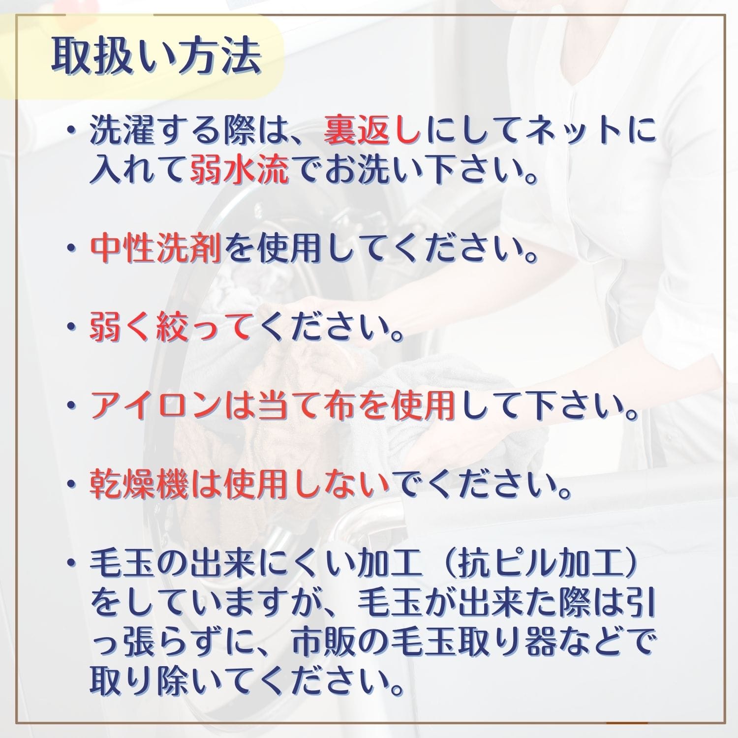 ・素材の特性上、毛玉ができる場合がありますが、できた際には千切らずにハサミなどでカットするようにしてください。