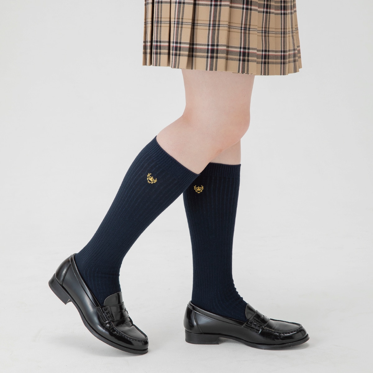 清楚な印象の32センチ丈の紺ソックス。クラウン刺繍入り!