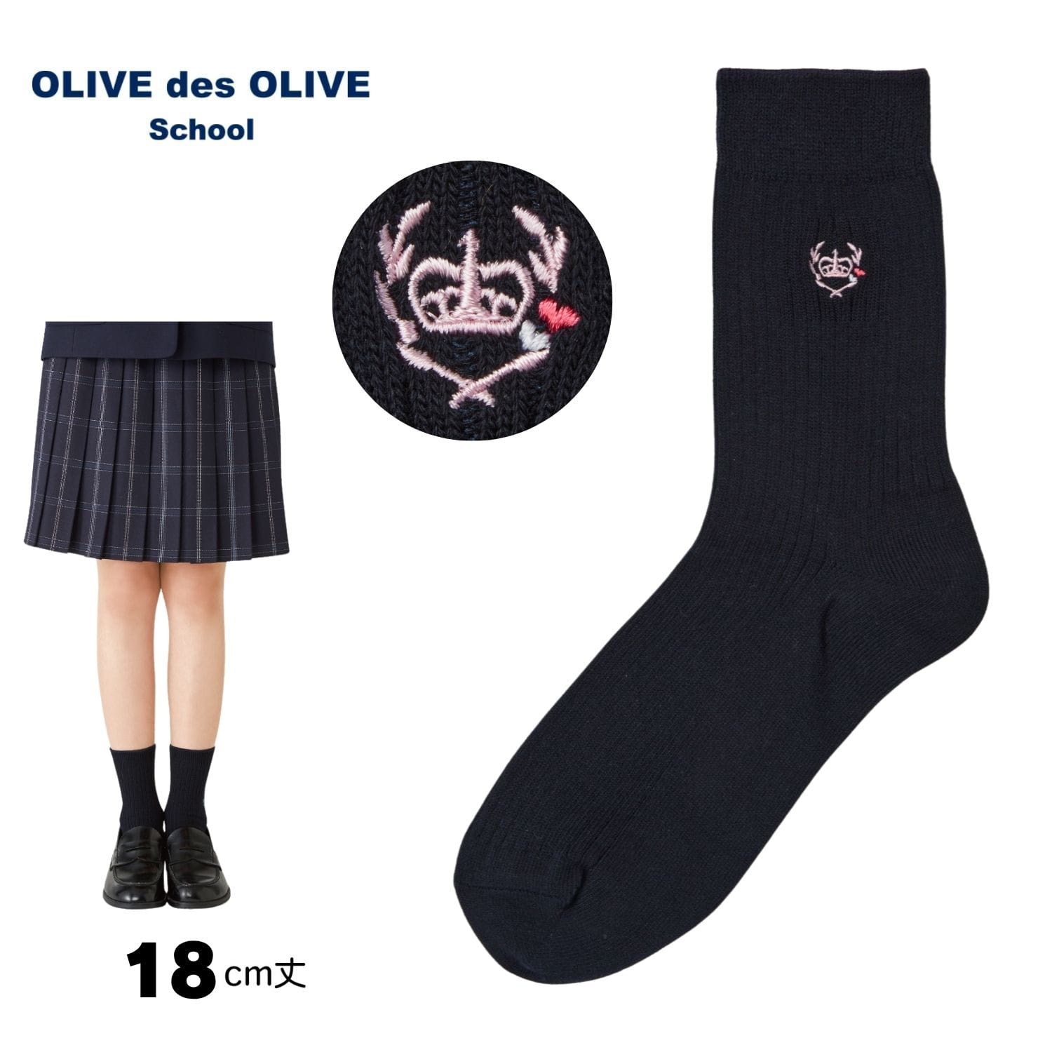靴下 紺 ソックス 18cm丈 ハートクラウン刺繍 オリーブデオリーブスクール