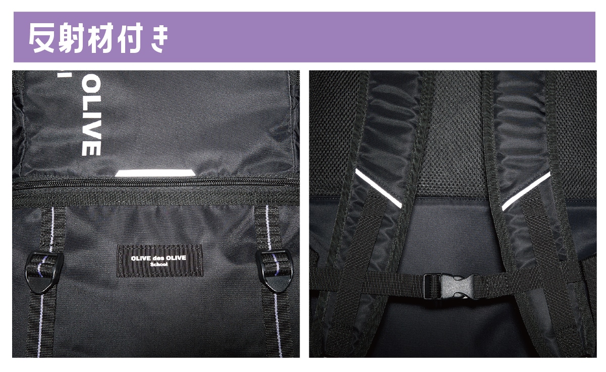 リュックの前後に反射材が付いています。車のライトをしっかり反射するので安心です。