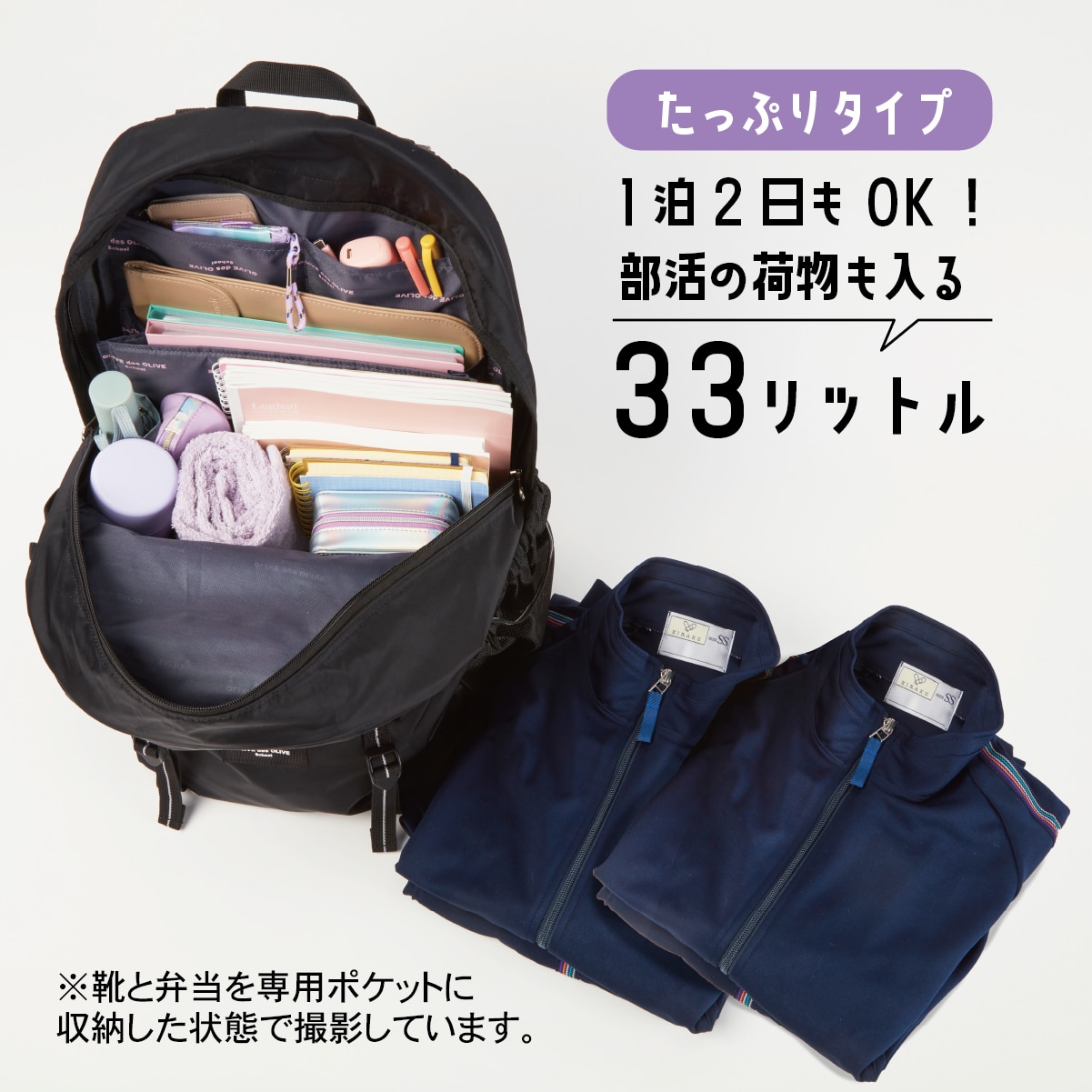 初めての通学リュックを選ぶならコレ!お弁当とシューズ収納ポケットがついた大容量の33リットルタイプ!