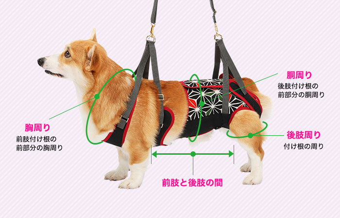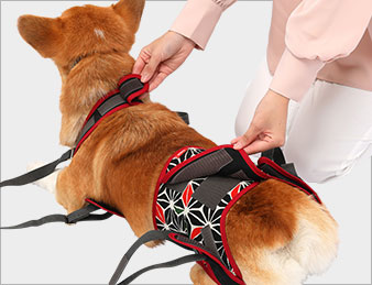 腰が悪くなったり、脚力が低下したワンちゃんの起き上がりを助け、歩行を補助するハーネスです