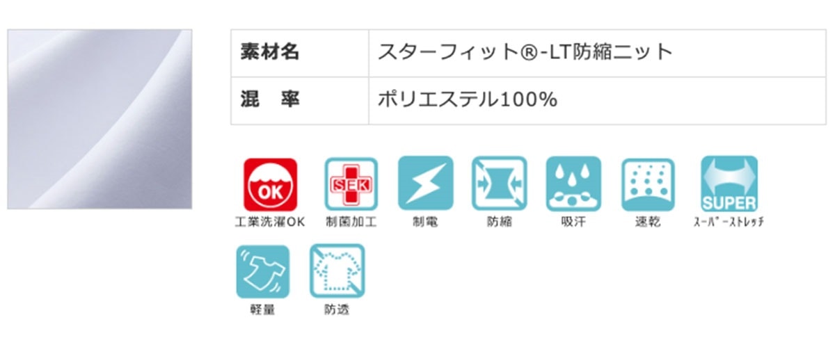 - 制菌加工 / 制電 / スーパーストレッチ / 防縮 / 吸汗 / 速乾 / 軽量 / 防透