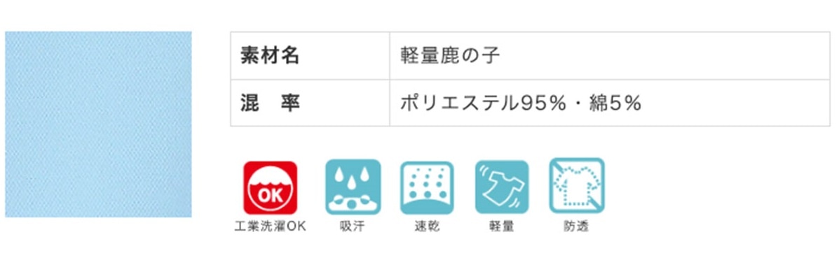 汗を素早く吸収し、快適な着心地を持続する素材です。汗や水を素早く発散する素材です。洗濯後の乾燥も早い素材です。軽い着心地の素材です。下着などが透けにくい素材です。工業洗濯に対応した、縮みの少ない素材です。
