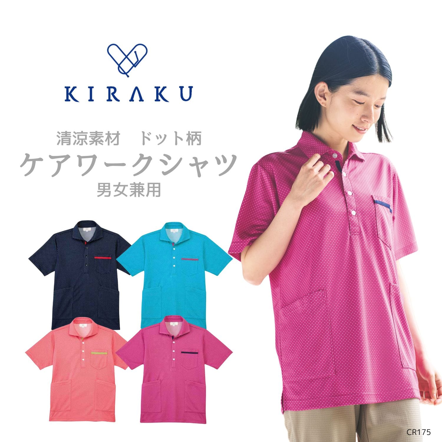【品番: CR175 】 男女兼用 ニットシャツ 介護士 UVカット ベタつかない 肌に優しい ドット柄 キラク