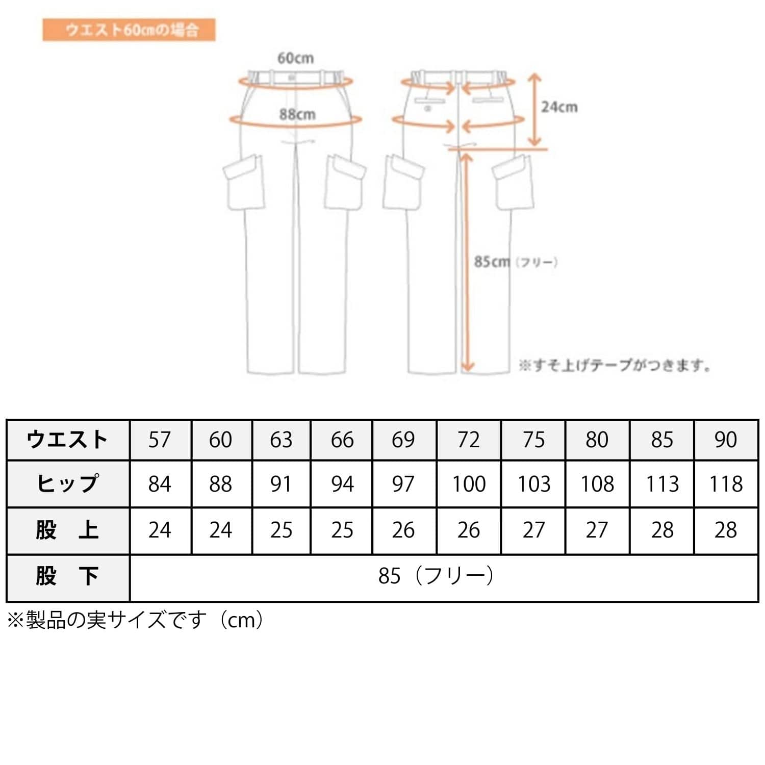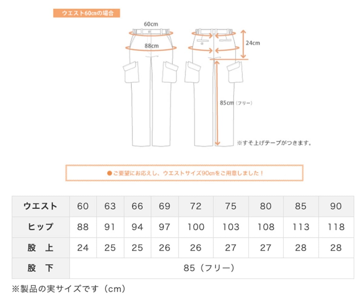 - ウエスト 57 / 60 / 63 / 66 / 69 / 72 / 75 / 80 / 85 / 90 (cm)
