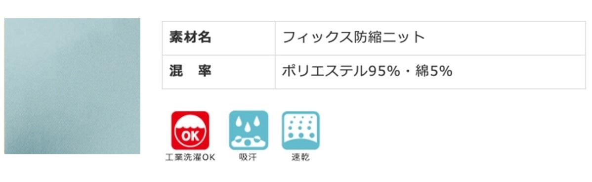 工業洗濯に対応した、縮みの少ない商品です。 ※濃色は汚染の可能性がございますので、白物と分けてお洗いください。 洗濯や、乾燥機による縮みが少ない素材です。 肌面の汗をすばやく吸い取る素材です。汗をかいても快適な着心地が持続します。