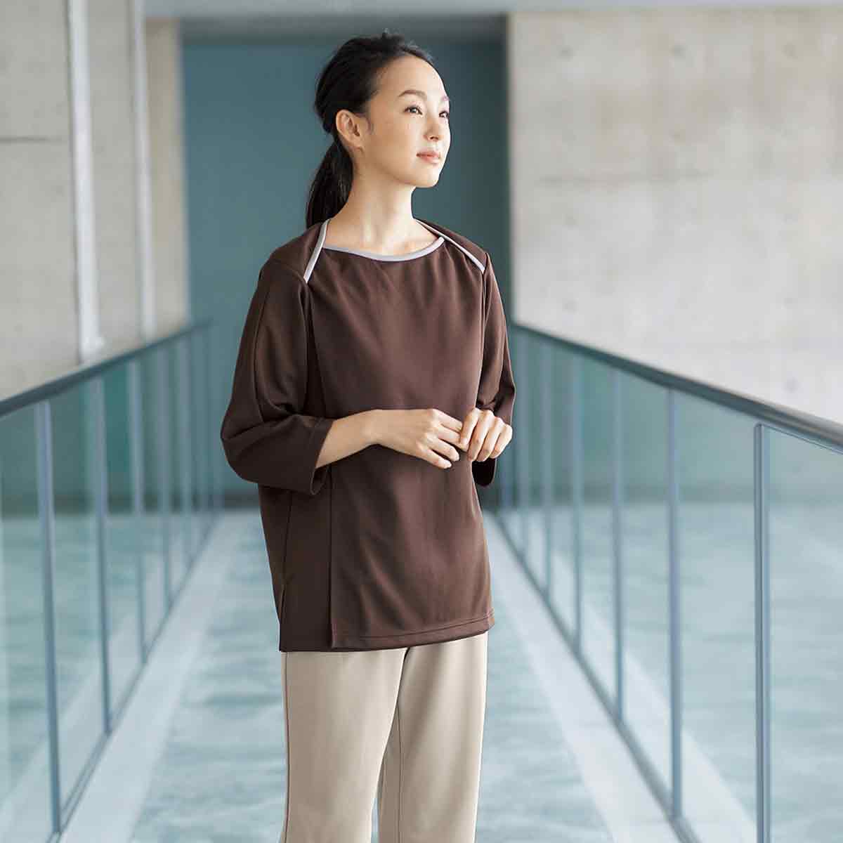 検査がしやすいボートネック。触診時には肩の合わせを開くことができます。