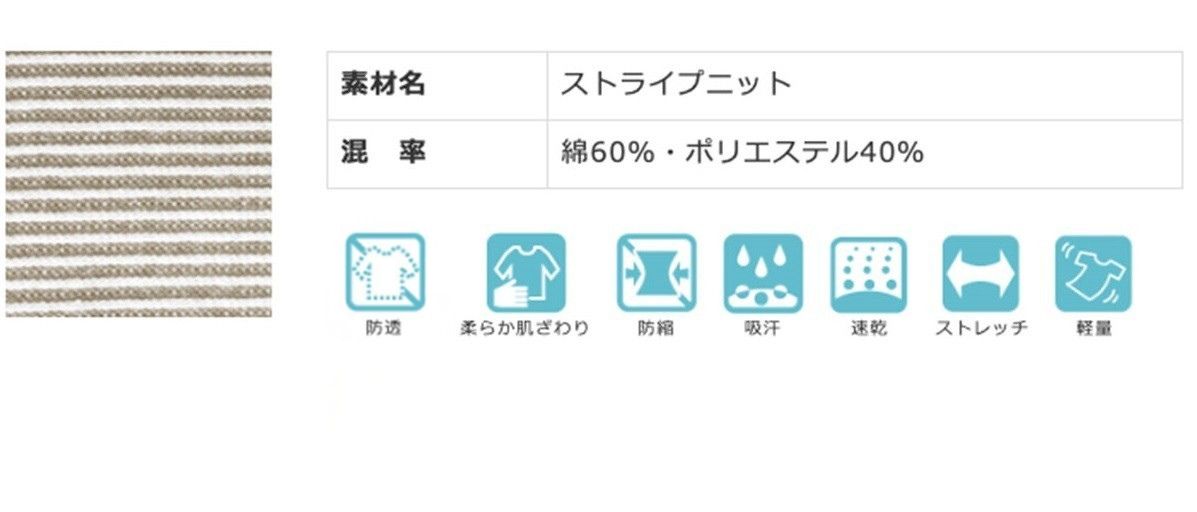 - 防縮 / 吸汗 / 速乾 / 軽量 / 柔らか肌ざわり / ストレッチ / 防透
