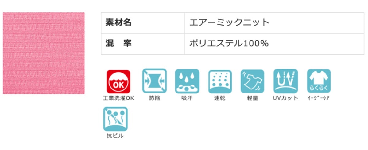 - 防縮 / 吸汗 / 速乾 / 軽量 / イージーケア / 抗ピル / UVカット