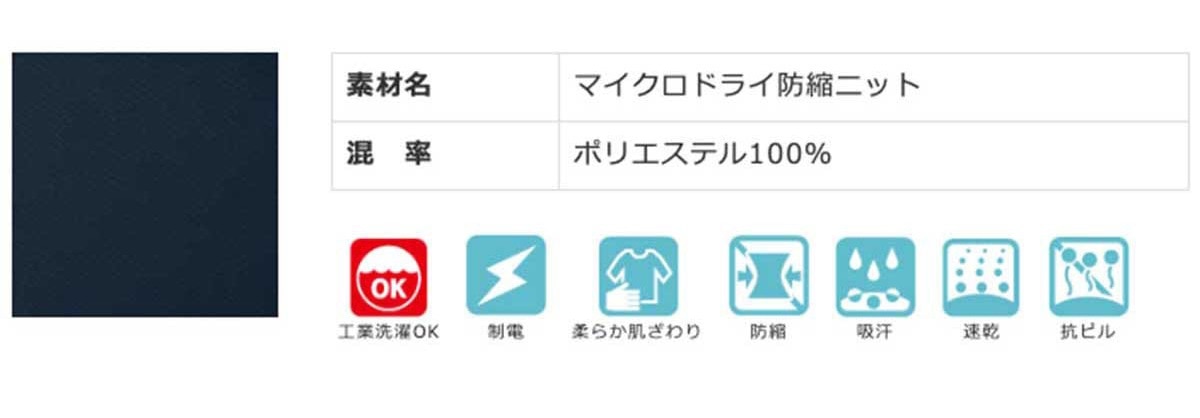 - 制電 / 防縮 / 吸汗 / 速乾 / 抗ピル / 柔らか肌ざわり
